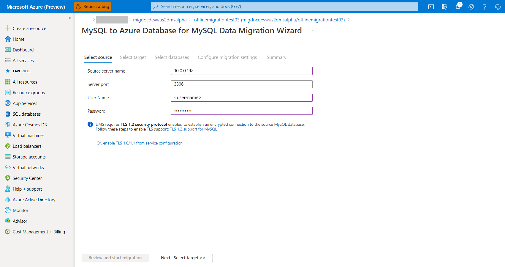 サーバー レベルの ファイアウォール規則 を作成するか、ターゲット Azure Database for MySQL の 仮想ネットワーク サービス エンドポイントを構成 して、Azure Database Migration Service の Virtual Network からターゲット データベースへのアクセスを許可します。