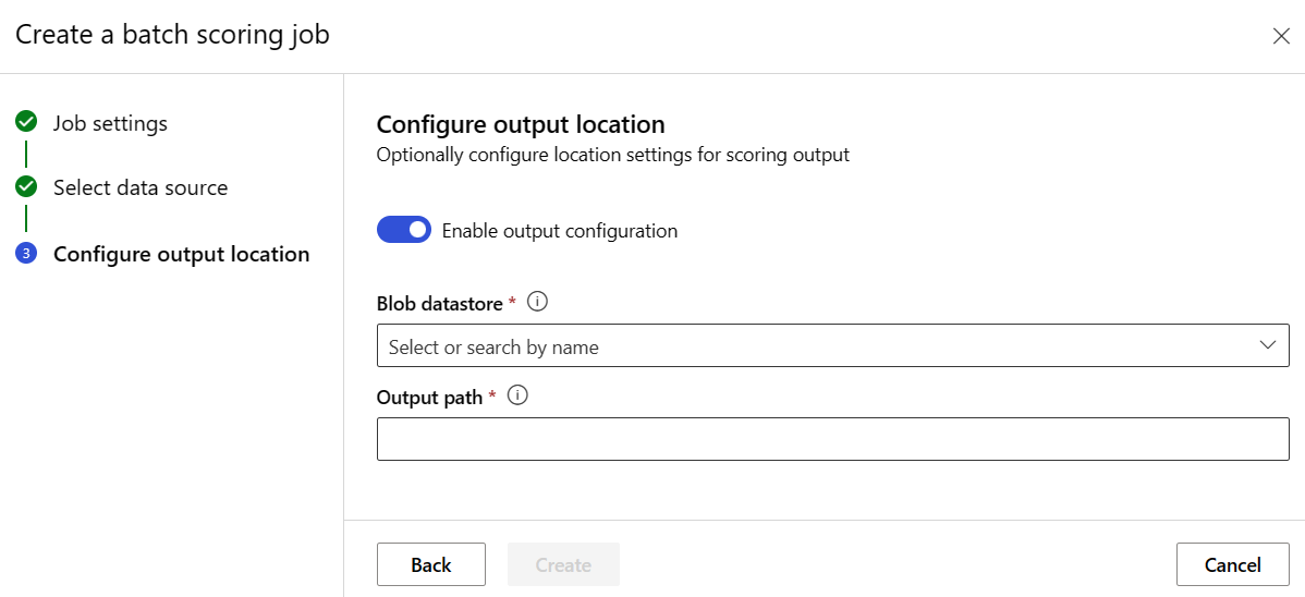 一意の出力場所を使用する必要があります。 出力ファイルが存在する場合、バッチ スコアリング ジョブは失敗します。