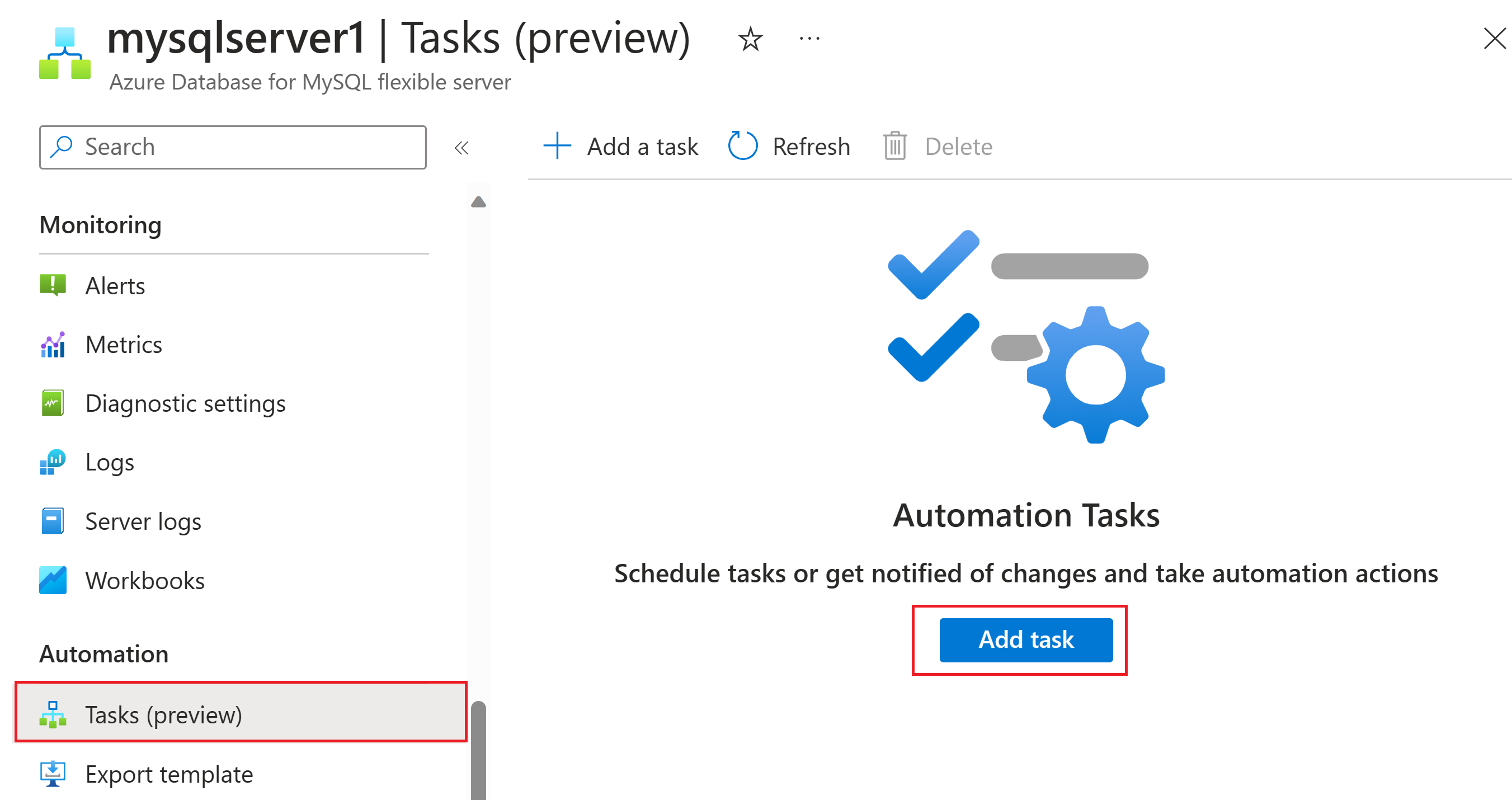 リソース ナビゲーション メニューの [Automation] セクションで、 [タスク (プレビュー)] を選びます。 [タスクの追加] を選択して、タスク テンプレートを選択します。