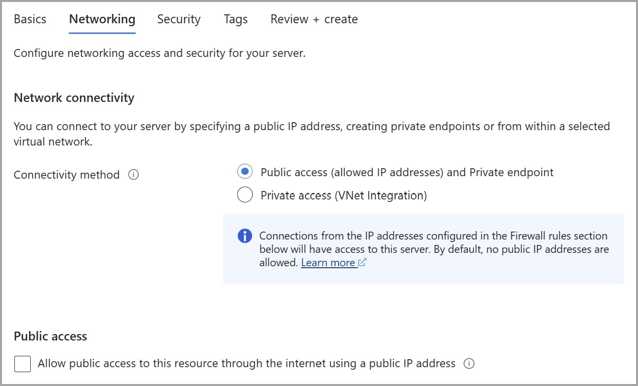 Azure Database for MySQL フレキシブル サーバー インスタンスでパブリック アクセスを無効にするには、[パブリック アクセス] の下にある [パブリック IP アドレスを使用してインターネット経由でこのリソースへのパブリック アクセスを許可する] をオフにします。