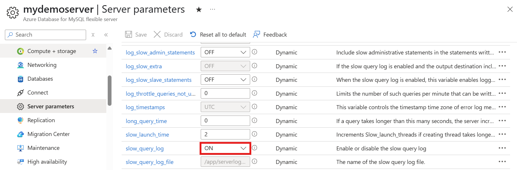 Azure portal を使用して低速クエリ ログを構成する