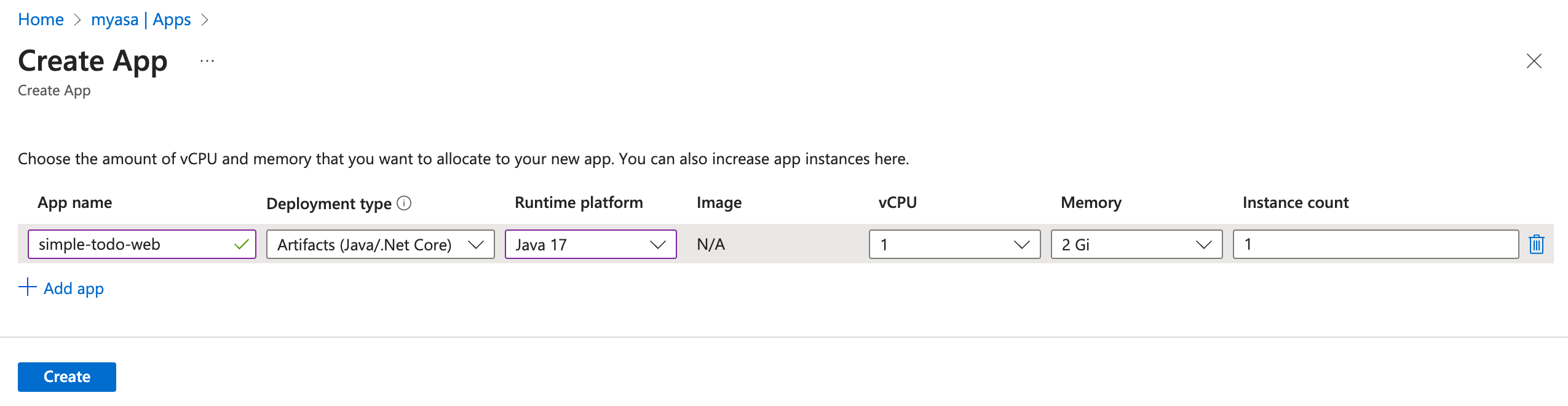 [アプリの作成] ページで、アプリ名に「simple-todo-web」を使い、ランタイム プラットフォームには [Java 17] を選択します。