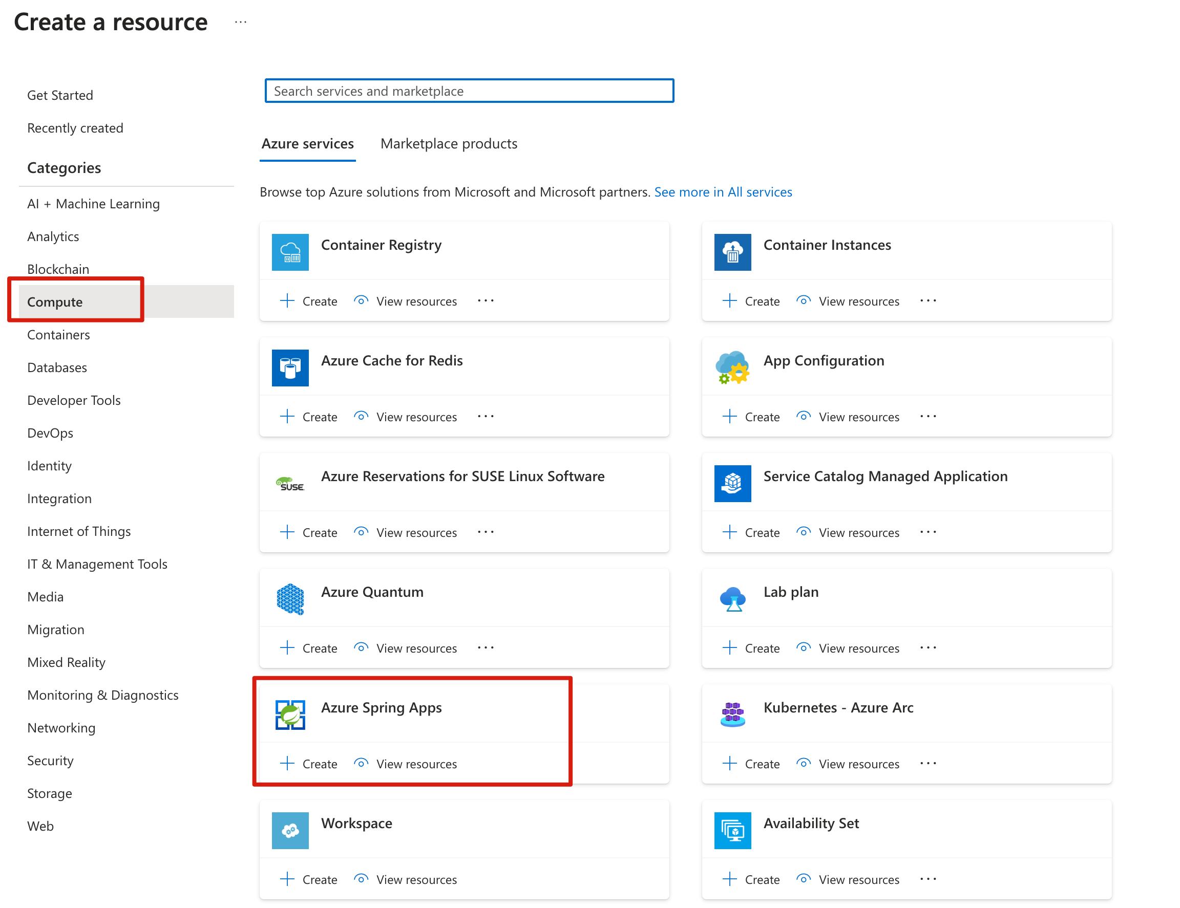 [Compute]>[Azure Spring Apps] を選択します。