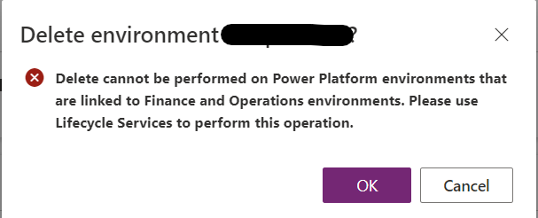財務と運用アプリ環境とリンクしている Power Platform 環境では、削除を実行できません。 Lifecycle Services を使用してこの操作を実行してください。