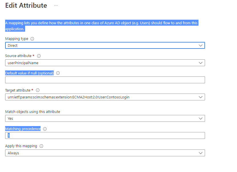 | 直接 | userPrincipalName | urn:ietf:params:scim:schemas:extension:ECMA2Host:2.0:User:ContosoLogin |