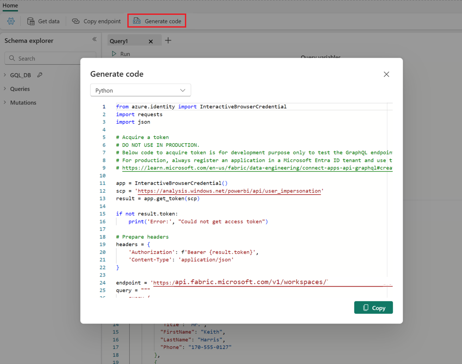 開始するには、クエリを実行し、[コードの 生成 ] ボタンを選択し、それに応じて言語を選択します。