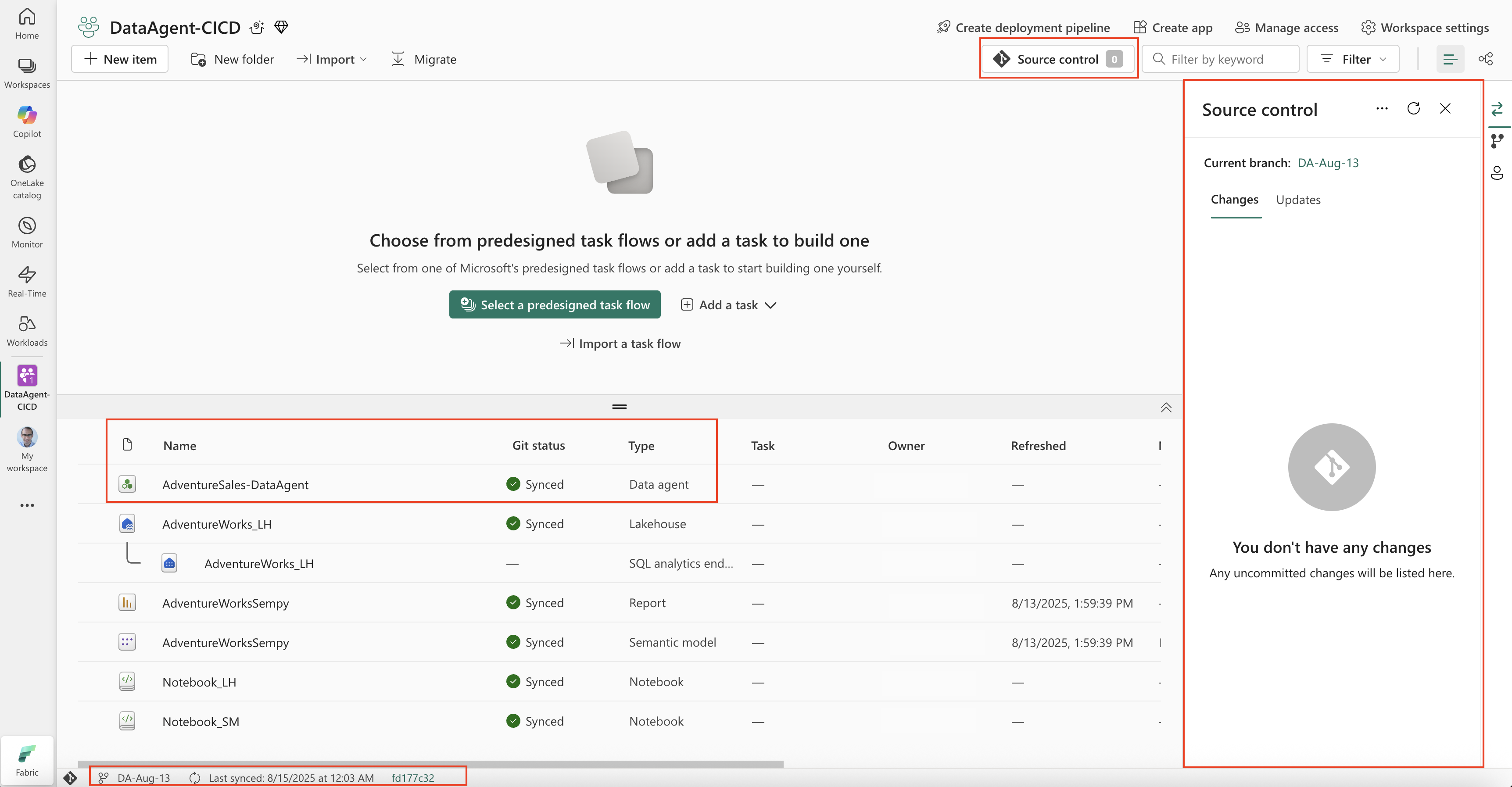Git リポジトリに接続すると、Fabric データ エージェントを含むワークスペース項目が [ソース] コントロール パネルに表示されます。 左下のステータス バーには、接続されているブランチの名前、最後の同期時刻、Git コミット ID が表示されます。