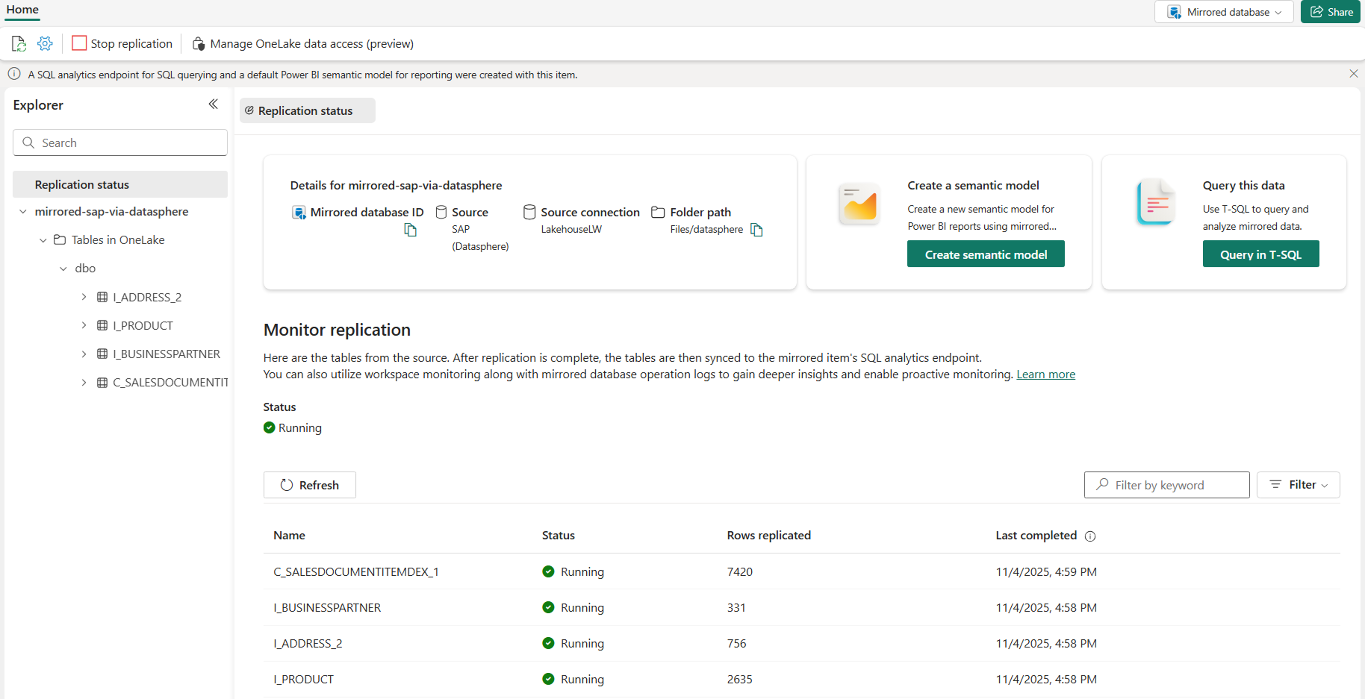 ミラーリングが開始され、監視ページが表示されます。 数分後に、レプリケートされた行の数が表示され、SQL 分析エンドポイントでデータを表示できます。