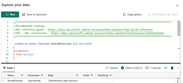 .create-or-alterコマンドは、[データの探索] ウィンドウに自動的に設定されます。プレースホルダー テキストの代わりに関数の関数名とクエリ パラメーターを入力し、[実行] を選択します。