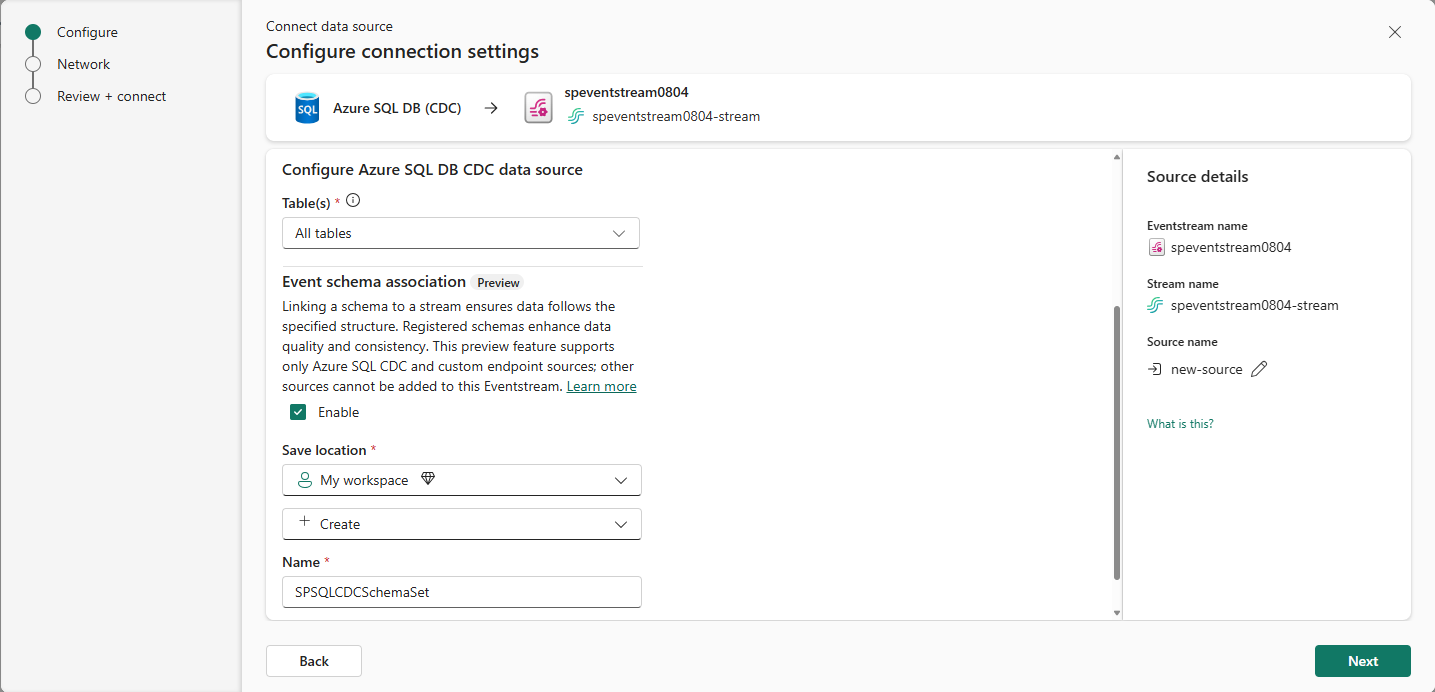 CDC を介した自動テーブル スキーマ登録を使用して Azure SQL データベースから Eventstream に変更データを取り込みます。
