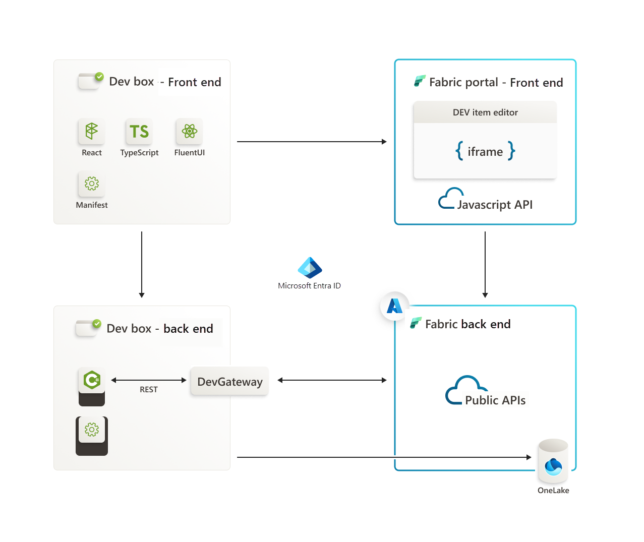 フロントエンドは、Fabric ポータルの iframe 内で動作するユーザー エクスペリエンス (UX) と動作の基本として機能します。 Fabric パートナーには、アイテム エディターを含む特定のユーザー インターフェイス エクスペリエンスが提供されます。 拡張クライアント SDK には、通常の Web アプリを Fabric ポータル内でシームレスに動作する Micro Frontend Web アプリに変換するのに必要なインターフェイス、API、ブートストラップ機能が備わっています。