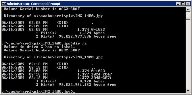 キャッシュ ドライブ上の IMG_1400.jpg 格納先フォルダーを探し、「dir /a」と入力してその内容を一覧表示します。