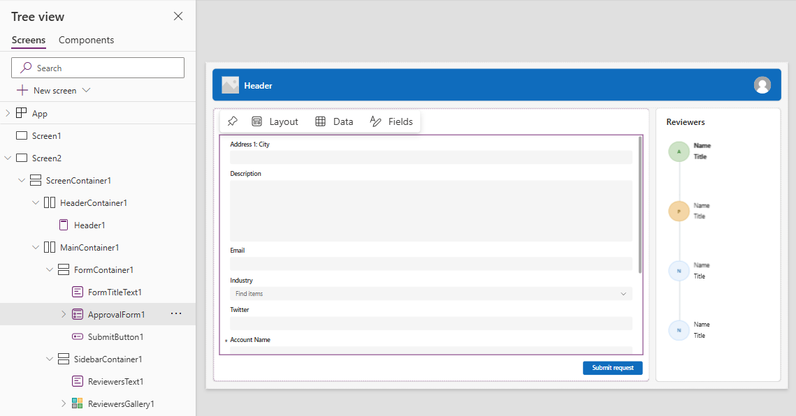 承認要求画面には、ヘッダー、送信ボタンのあるフォーム、定義済みのステージがあるギャラリーがあります。 承認要求画面は、承認要求の送信やビジネスのワークフロー プロセスの表示など、フォーム送信によってアクションがトリガーされるシナリオで有用です。