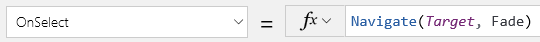 矢印を選択した状態で、OnSelect プロパティを Navigate 関数に設定します。たとえば、Navigate(Target, Fade) などです。