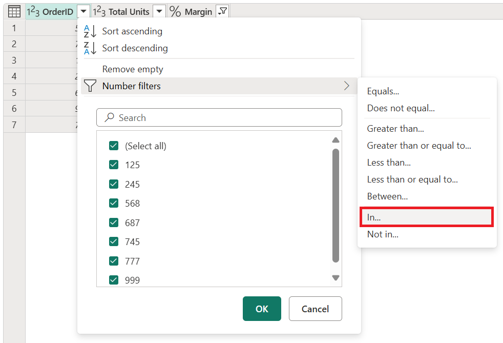 新しい 興味深い注文 リストのパラメーターが設定された状態で、 Orders クエリに戻ります。 OrderID フィールドのオートフィルター メニューを選択します。 [ 数値フィルター>In] を選択します。