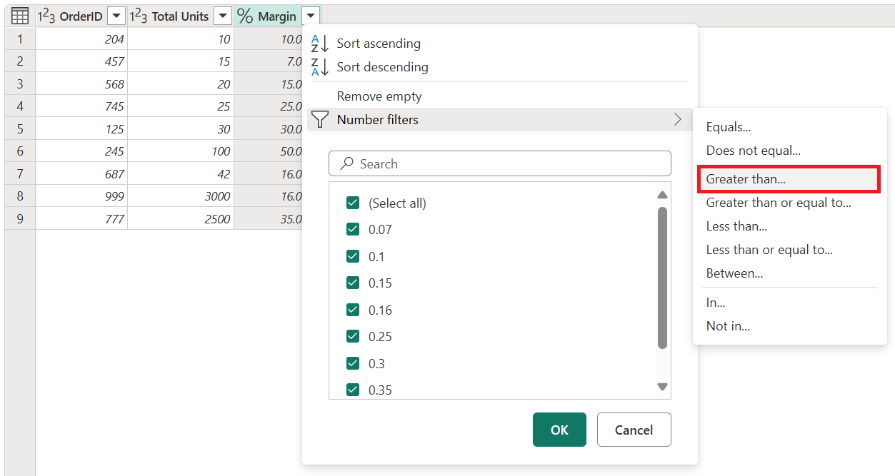 Orders クエリに移動し、[余白] フィールドで [より大きい] フィルター オプションを選択します。