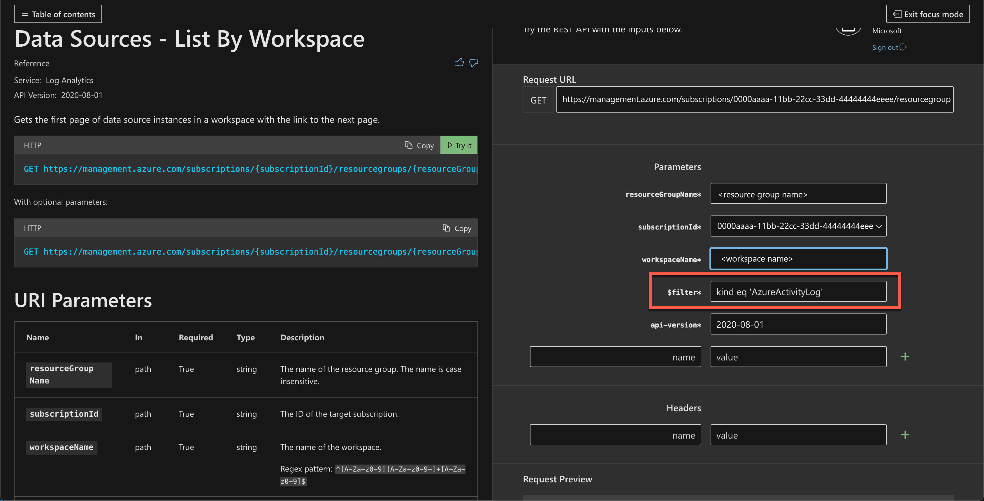 kind eq 'AzureActivityLog'を設定してアクティビティ ログをフィルター処理します。API 応答から無効にする接続の名前をコピーします。
