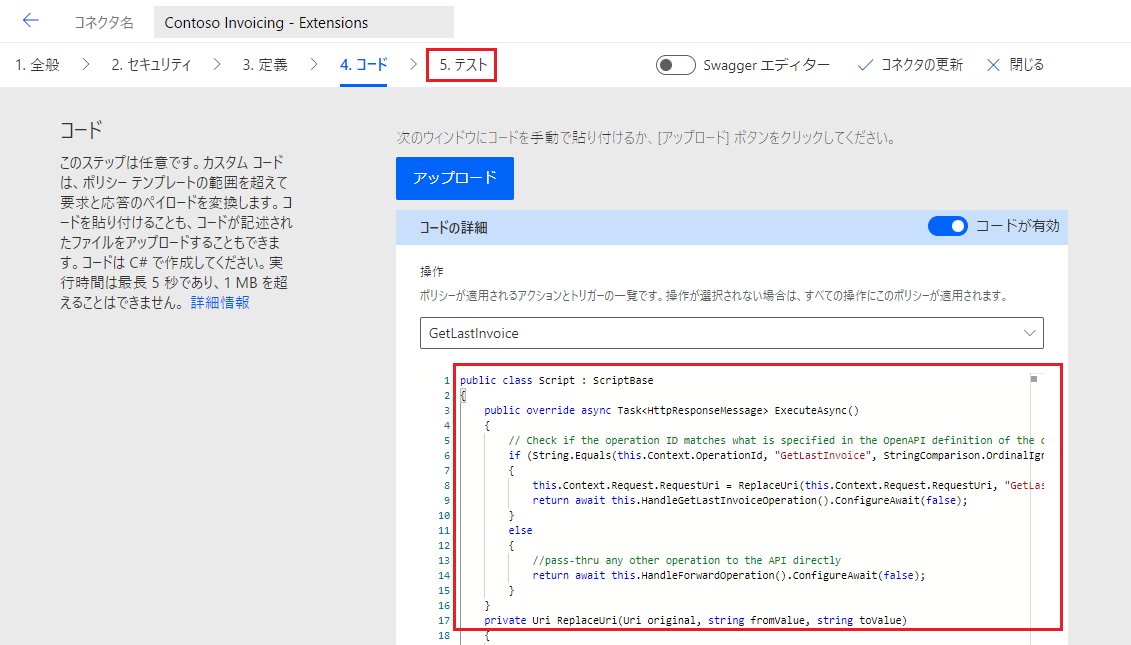 ListInvoice 操作は追加されているが、LastInvoice 操作は追加されていない Contoso Invoicing カスタム コネクタを変更します。 そのため、LastInvoice 操作を追加して、作成された最新の請求書を取得します。 Contoso Invoicing のネットワーク API ではこの操作はサポートされないため、LastInvoice 操作で実行されているカスタム コードを使用して、要求を API の ListInvoice にリダイレクトした後、作成された最新の請求書のみを返すよう応答を変換します。