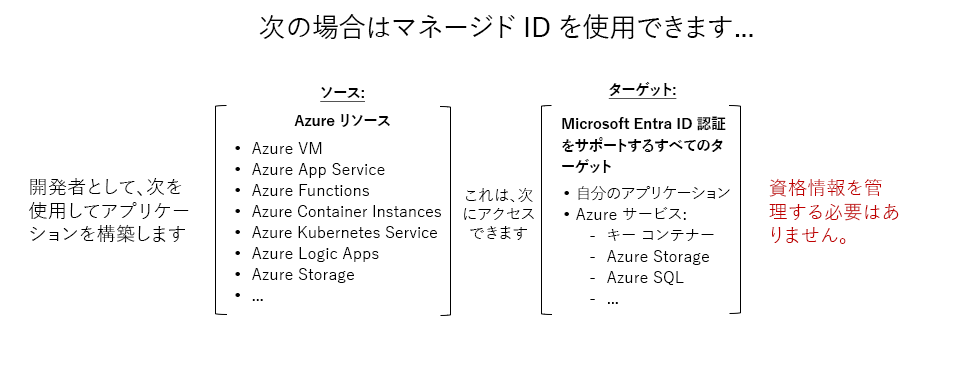 サービス プリンシパルで Microsoft Entra テナントによってセキュリティ保護されているリソースにアクセスできるようにする場合は、アプリケーション開発者が資格情報を管理して保護する必要があります。 管理と保護が正しく行われなければ、セキュリティの脆弱性が発生する可能性があります。 マネージド ID は、開発者をその責任から解放するのに役立ちます。