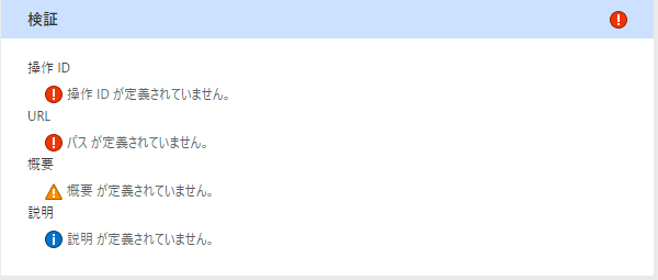 前の画像で、命名パターンが一貫していないことに注意してください。概要には、スペースを含む名前もあれば、スペースを含まない名前もあります。 このエラーを修正するには、ポータルのフィールドを更新します。または、API を所有している場合は、インポートする OpenAPI 定義で提供される情報の更新を開発者に依頼します。 ポータルで手動で変更を行った後に OpenAPI 定義を再度インポートすると、変更が上書きされますので注意してください。