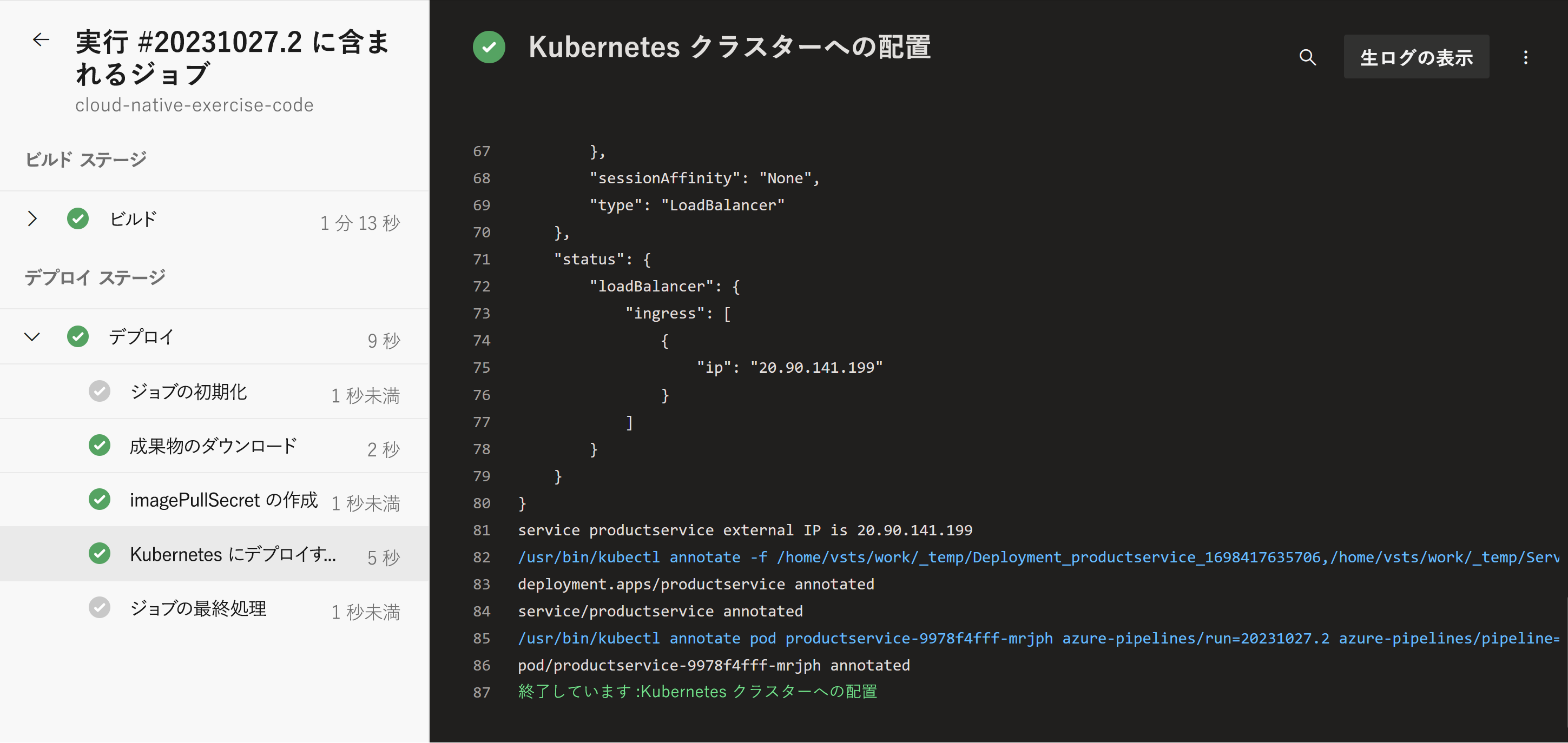 最後のステージは、更新された製品サービスを AKS に デプロイ することです。 このジョブでは、 KubernetesManifest タスクを使用してイメージを AKS にデプロイします。