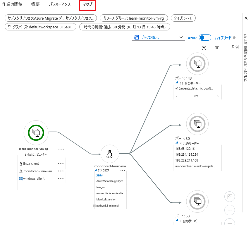 ![VM 分析情報の [マップ] タブの依存関係マップを示すスクリーンショット。](media/dependency-map.png)