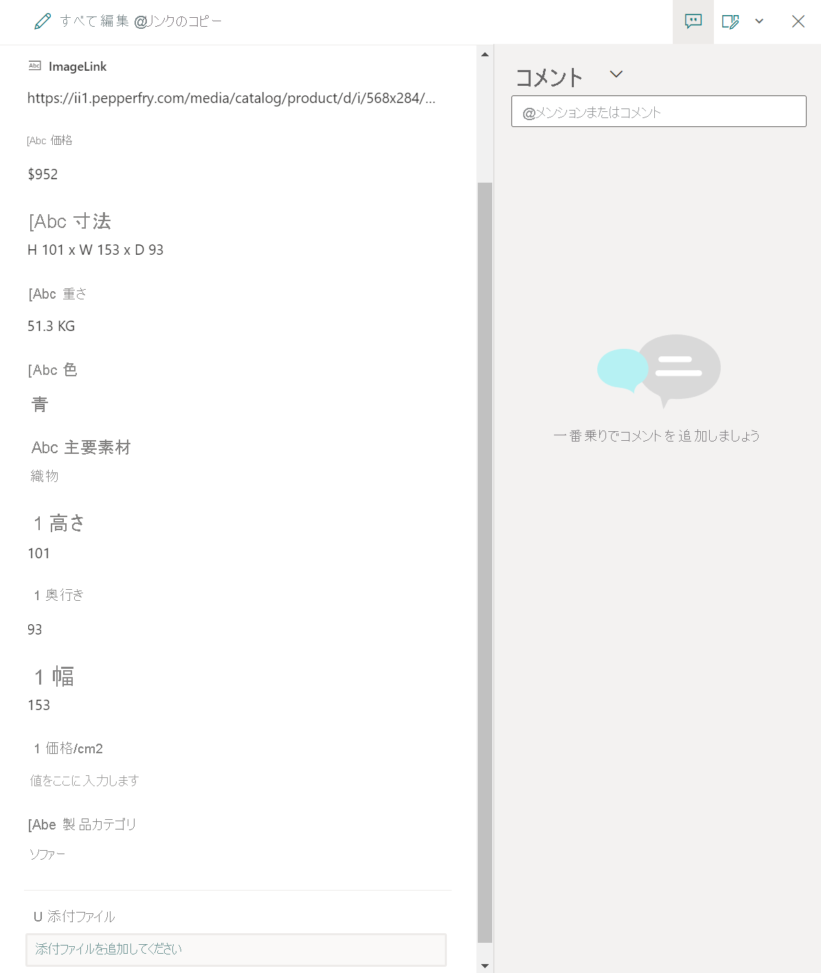 リスト内の項目を選択し、[ 添付ファイルの追加] を選択します。 Power Apps カスタム フォルダーで、3D モデル (.glb ファイル) または Image (.jpg ファイル) を選択します。 リストのすべての項目に対して同じ手順に従います。