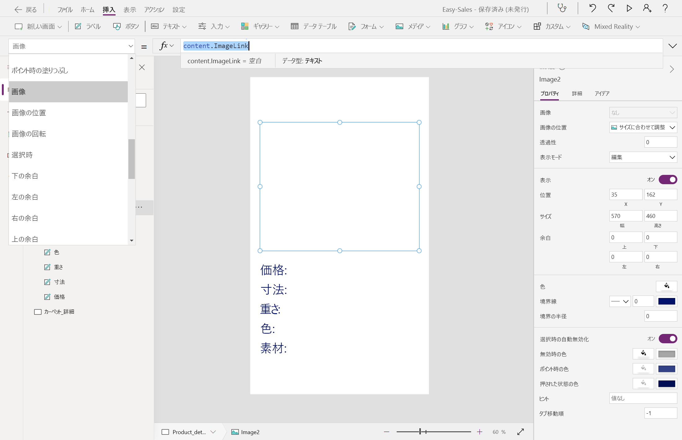 content.'{Name}'[ メディア ] ドロップダウンを選択し、[ イメージ ] を選択して 、Product_details 画面に画像を挿入します。 次の方法で Image プロパティを構成します。