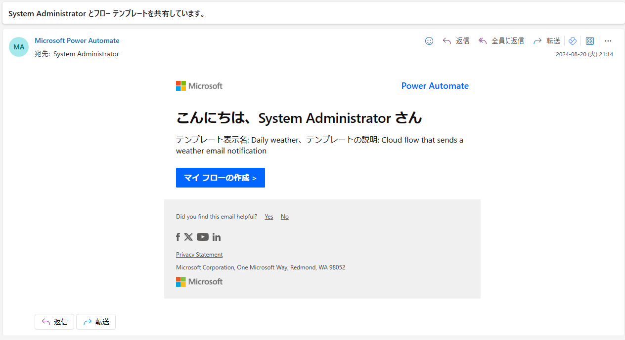 個々のユーザーにコピーを送信すると、ユーザーは次の画像のようなメールを受け取り、フローを作成する機能を起動できます。 グループにコピーを送信した場合、メールは送信されません。 代わりに、グループ メンバーはフロー ポータル上のコピーにアクセスできます。