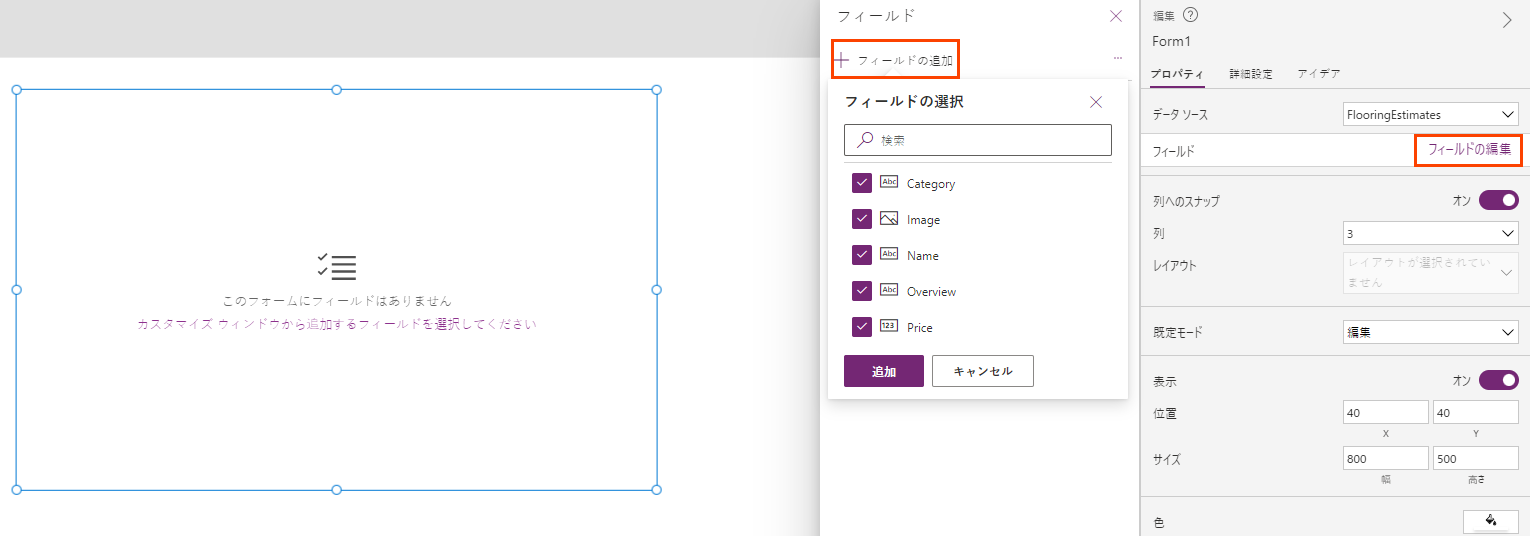 右側のプロパティ パネルで、フィールドの編集 > + フィールドの追加を選択し、利用できるすべてのフィールド (カテゴリ、画像、名前、概要、価格) を選択します。 その後、追加を選択します。