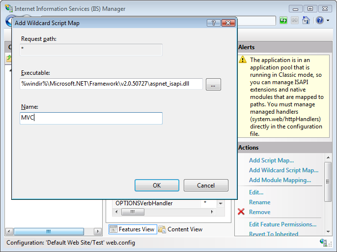 ASP.NET MVC 애플리케이션에 대한 URL을 수정하지 않고 웹 서버에 액세스할 수 있는 경우 추가 옵션이 있습니다. 모든 요청을 웹 서버에 매핑하는 와일드카드 스크립트 맵을 ASP.NET 프레임워크에 만들 수 있습니다. 이렇게 하면 기본 ASP.NET MVC 경로 테이블을 IIS 7.0(클래식 모드) 또는 IIS 6.0과 함께 사용할 수 있습니다.