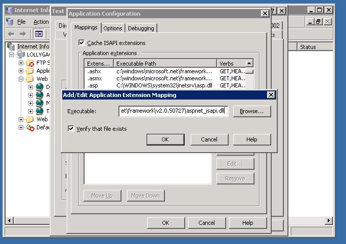 - aspnet_isapi.dll 경로를 실행 파일 필드에 붙여넣습니다(.aspx 파일에 대한 스크립트 맵에서 이 경로를 복사할 수 있음).