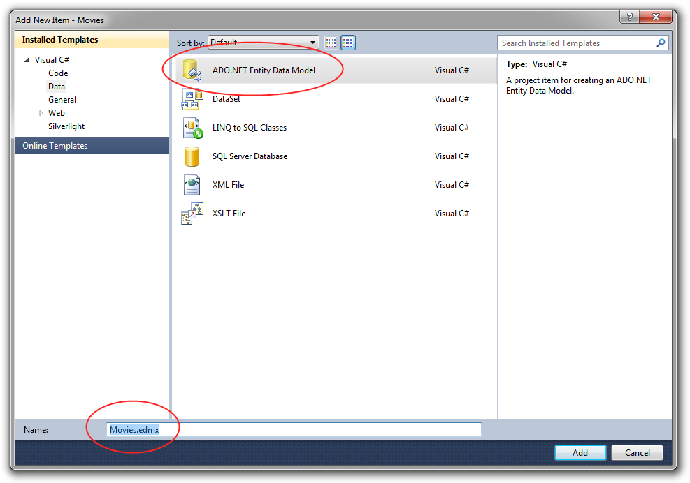 새 데이터베이스에서 엔터티 모델을 만들겠습니다. 이렇게 하면 데이터베이스 내에서 데이터를 쉽게 쿼리하고 조작할 수 있는 클래스 집합이 프로젝트에 추가됩니다. 대화 상자 왼쪽에서 데이터 노드를 선택한 다음, ADO.NET 엔터티 데이터 모델 항목 템플릿을 선택합니다. 이름을 Movies.edmx로 지정합니다.