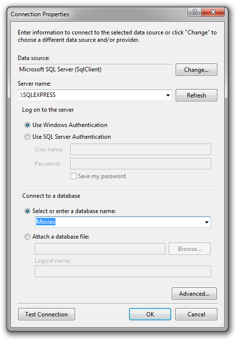 연결 추가 대화 상자에서 서버 이름에 ".\SQLEXPRESS"를 입력하고 새 데이터베이스의 이름으로 "Movies"를 입력합니다.