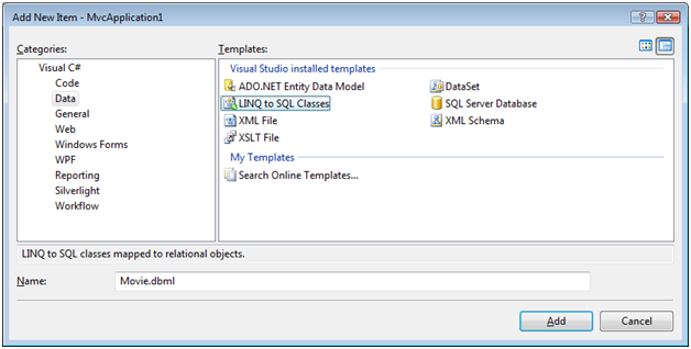 MVC 모델에는 tblMovie 데이터베이스 테이블을 나타내는 LINQ to SQL 클래스가 포함됩니다. 이러한 LINQ to SQL 클래스를 만드는 가장 쉬운 방법은 Models 폴더를 마우스 오른쪽 단추로 클릭하고, 추가, 새 항목을 선택하고, LINQ to SQL 클래스 템플릿을 선택하고, 클래스에 Movie.dbml이라는 이름을 지정하고, 추가 단추를 클릭하는 것입니다(그림 4 참조).