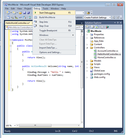 다음으로 시작 보기 템플릿이 필요합니다. 디버그 메뉴에서 MvcMovie 빌드를 선택하여 프로젝트가 컴파일되었는지 확인합니다.