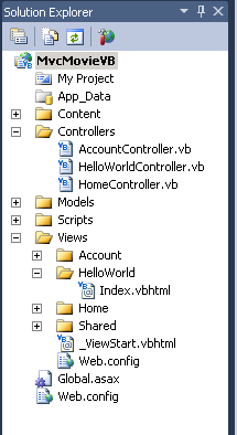 MvcMovie\Views\HelloWorld 폴더 및 MvcMovie\Views\HelloWorld\Index.vbhtml 파일이 만들어집니다. 솔루션 탐색기 볼 수 있습니다.