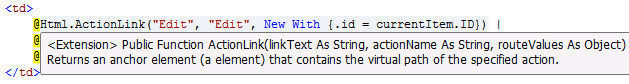 @Html.ActionLink("Edit", "Edit", New With {.id = currentItem.ID}) |