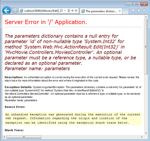 스캐폴딩 시스템에서 생성된 메서드는 HttpGet Edit 전달된 ID가 유효한지 확인하지 않습니다. 사용자가 URL(http://localhost:xxxxx/Movies/Edit)에서 ID 세그먼트를 제거하면 다음 오류가 표시됩니다.