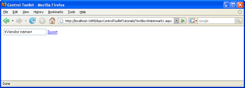 이제 사용자가 컨트롤의 FormView 삽입 모드로 변경되면 컨트롤 덕분에 TextBoxWatermarkExtender 새 공급업체의 텍스트 필드가 미리 채워집니다. 텍스트 상자 내부를 클릭하면 필러 텍스트가 사라집니다.