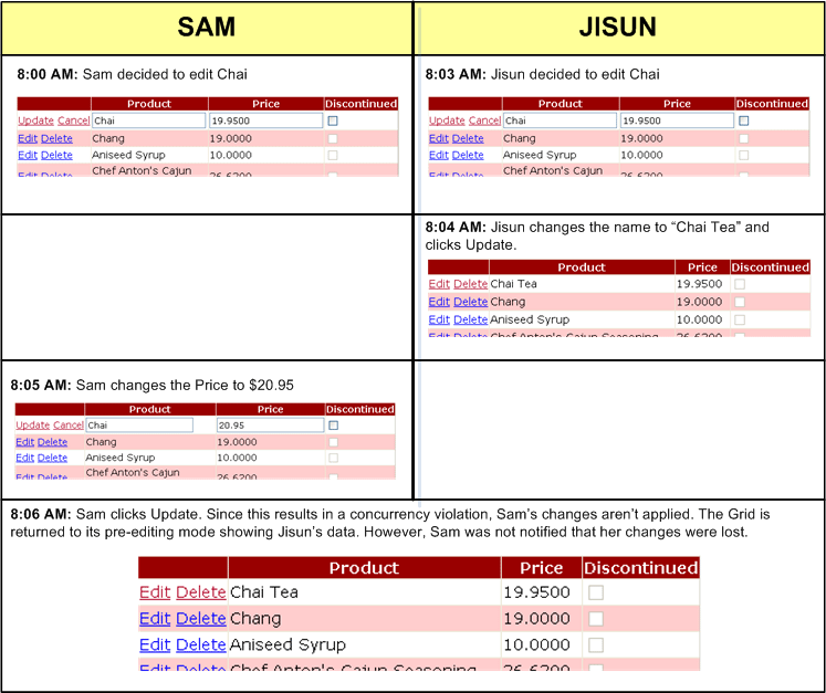 Jisun과 Sam이라는 두 사용자가 모두 방문자가 GridView 컨트롤을 통해 제품을 업데이트하고 삭제할 수 있는 애플리케이션의 페이지를 방문했다고 상상해 보세요. 둘 다 동시에 Chai에 대한 편집 단추를 클릭합니다. Jisun은 제품 이름을 Chai Tea로 변경하고 업데이트 단추를 클릭합니다. 최종 결과는 UPDATE 데이터베이스로 전송되는 문장입니다. Jisun이 하나의 필드만 업데이트했음에도 불구하고 제품의 모든 업데이트 가능한 필드를 설정합니다.ProductName. 이 시점에서 데이터베이스에는 이 특정 제품에 대한 값으로 차이 티, 카테고리인 음료, 공급업체인 Exotic Liquids 등이 있습니다. 그러나 Sam의 GridView 화면에는 편집 가능한 GridView 행의 제품 이름이 Chai로 표시됩니다. Jisun의 변경 내용이 커밋된 후 몇 초 후에 Sam은 범주를 Condiments로 업데이트하고 업데이트를 클릭합니다. 이렇게 하면 UPDATE이 데이터베이스로 보내져 제품 이름을 'Chai'로 설정하고, CategoryID를 해당 Condiments 카테고리 ID로 지정하는 SQL 문이 실행됩니다. 제품 이름에 대한 Jisun의 변경 사항이 덮어쓰여졌습니다.