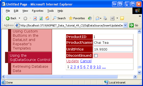 마찬가지로 현재 선택한 제품을 삭제하거나 시스템에 새 제품을 추가할 수 있습니다. 문은 InsertCommand, ProductName, UnitPrice, 및 Discontinued 열에서만 작동하므로, 다른 열에는 삽입 시 데이터베이스에서 할당한 NULL 또는 기본값이 있습니다. ObjectDataSource와 같이, 데이터베이스 테이블에서 InsertCommand에 NULL을 허용하지 않고 기본값도 없는 열이 누락된 경우, INSERT 문을 실행하려고 할 때 SQL 오류가 발생합니다.