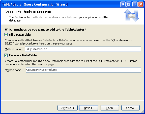저장 프로시저는 이름이 지정된 static클래스 파일 내에서 메서드로 partialStoredProcedures 구현됩니다. 또한 메서드는 GetDiscontinuedProducts 메서드를 SqlProcedure attribute저장 프로시저로 표시하는 데코레이팅됩니다.
