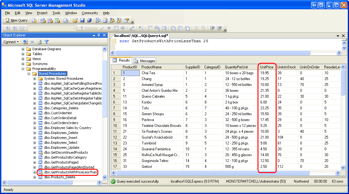 그러면 명명 GetProductsWithPriceGreaterThan 된 Northwind 데이터베이스에 새 저장 프로시저가 만들어지고 관리되는 메서드 GetProductsWithPriceGreaterThan (클래스 StoredProcedures에 있는 어셈블리 ManuallyCreatedDBObjects에 있는)와 연결됩니다.