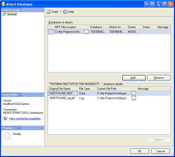 폴더에 있는 DataFiles Northwind 데이터베이스(또는 이동한 위치)를 SQL Server 2005 Express Edition 데이터베이스 인스턴스에 연결해야 합니다. 데이터베이스 폴더를 마우스 오른쪽 단추로 클릭하고 상황에 맞는 메뉴에서 연결 옵션을 선택합니다. 그러면 데이터베이스 연결 대화 상자가 나타납니다. 추가 단추를 클릭하고 적절한 NORTHWND.MDF 파일로 드릴다운한 다음 확인을 클릭합니다. 이 시점에서 화면은 그림 2와 유사하게 표시됩니다.