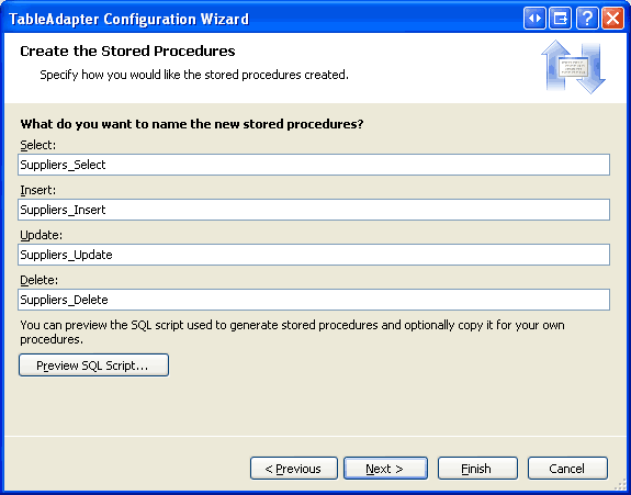 기본 쿼리를 입력하고 다음을 클릭하면 마법사에서 생성할 4개의 저장 프로시저의 이름을 지정합니다. 그림 4와 Suppliers_SelectSuppliers_InsertSuppliers_Update같이 이러한 저장 프로시저의 이름을 지정하고 Suppliers_Delete이름을 지정합니다.