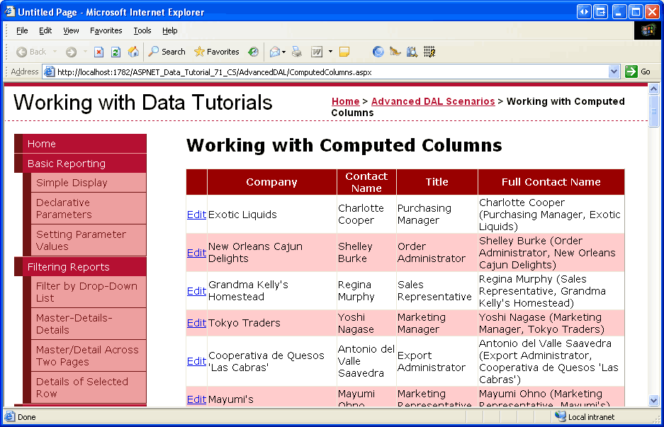 다음으로 브라우저를 통해 이 페이지를 방문합니다. 그림 12에서 볼 수 있듯이 각 공급자는 열이 포함된 FullContactName 표에 나열됩니다. 이 열 값은 단순히 (ContactName, ContactTitle)로 CompanyName 형식이 지정된 다른 세 열의 연결입니다.
