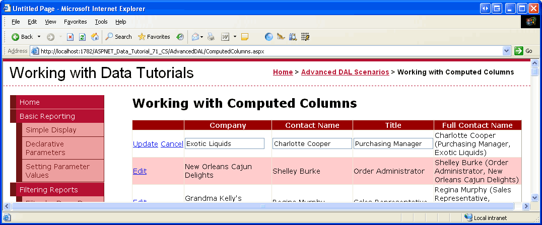 이 자습서에서는 계산 열에서 제기되는 문제를 우회하기 위한 기술에 대해 설명했습니다. 특히 TableAdapter의 저장 프로시저를 사용하여 임시 SQL 문을 사용하는 TableAdapters에 내재된 취약성을 극복했습니다. TableAdapter 마법사에서 새 저장 프로시저를 만들도록 하는 경우 기본 쿼리가 있는 경우 데이터 수정 저장 프로시저가 생성되지 않도록 하기 때문에 처음에는 계산된 열을 생략하는 것이 중요합니다. TableAdapter를 처음 구성 SelectCommand 한 후에는 계산된 열을 포함하도록 저장 프로시저를 재정비할 수 있습니다.