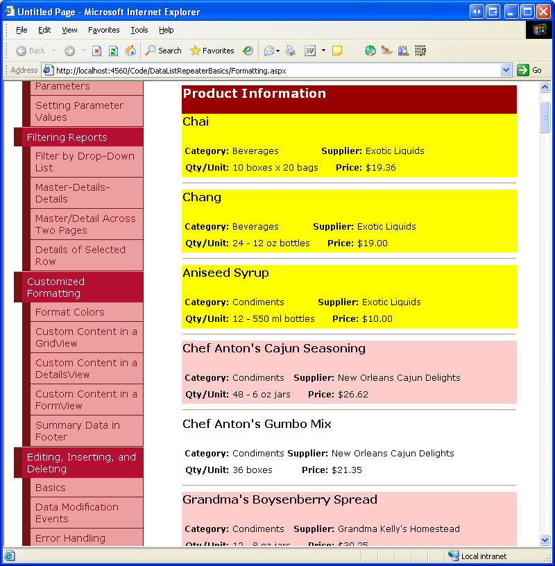ItemDataBound 이벤트 처리기가 완료되면 브라우저에서 Formatting.aspx 페이지를 다시 방문합니다. 그림 2에서 알 수 있듯이 가격이 $20.00 미만인 제품은 이름과 가격이 모두 강조 표시되어 있습니다.