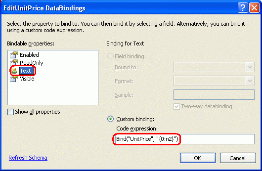 이 연습에서는 옵션 #1을 사용하겠습니다. 현재는 다음의 UnitPrice TextBoxEditItemTemplate<%# Bind("UnitPrice", "{0:c}") %>에 대한 데이터 바인딩 식으로 인해 통화 형식이 지정됩니다. 빈드 문을 두 자리 자릿수의 숫자로 서식을 지정하는 Bind 문을 Bind("UnitPrice", "{0:n2}")변경합니다. 선언적 구문을 통해 직접 수행하거나 TemplateField EditUnitPrice 의 TextBox UnitPrice 에서 EditItemTemplate DataBindings 편집 링크를 클릭하여 수행할 수 있습니다(그림 9 및 10 참조).